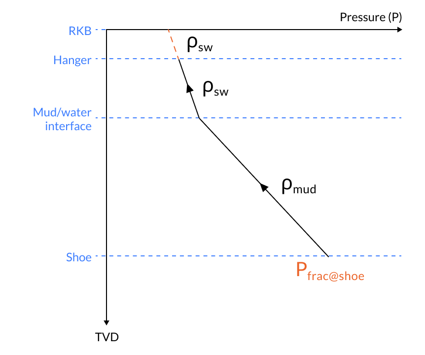 Calculate the hydrostatic pressure from shoe to hanger, taking the mud-water interface into account. Explicitly, if the mud-water interface is below the shoe, i.e. , then the internal pressure in the tubing, parametrised by TVD, is given by