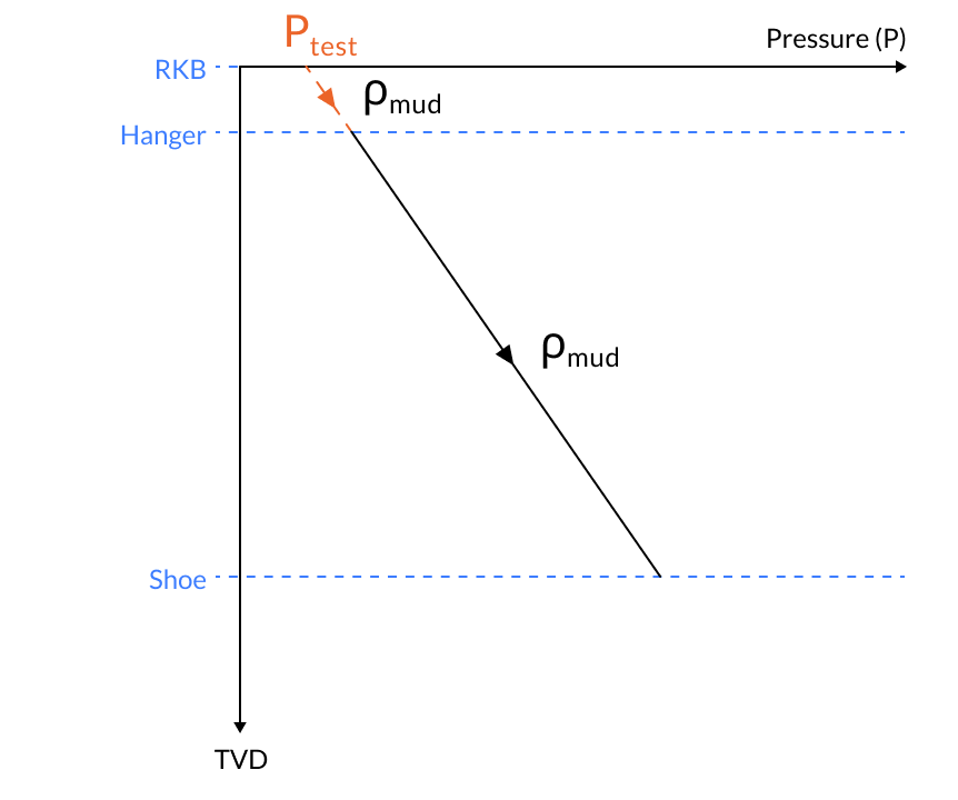 Without plug The internal pressure profile is given by the hydrostatic pressure from mud plus test pressure from hanger to shoe, i.e.