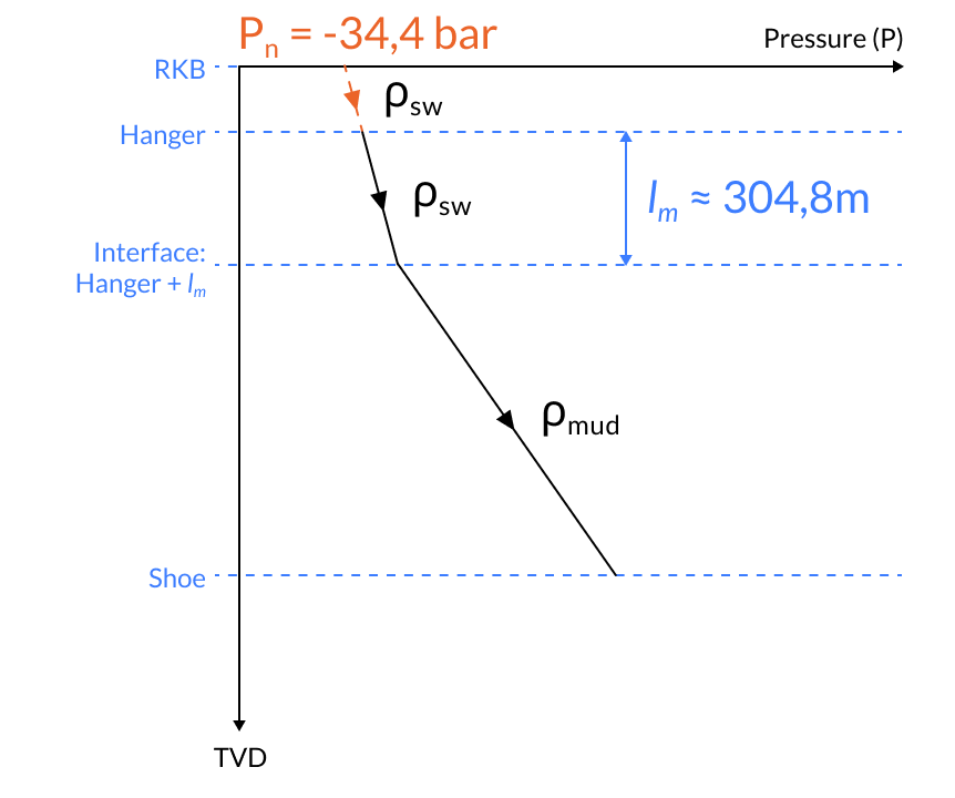 Negative pressure test is a collapse load case for production. The initial pressure is set to P = -34,4 bar at RKB. The pressure profile is given by the water gradient from RKB to meters below the mud line. From the mud line to the casing shoe, the pressure profile is given by the hydrostatic mud pressure.